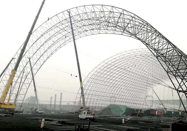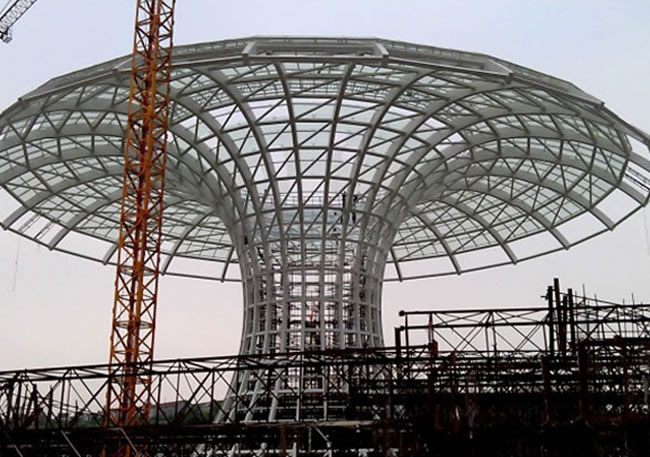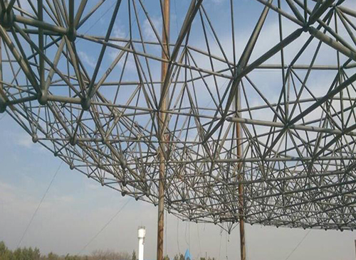 球形網架施工方案  1、工程概況和總體部署  網架采用正放四角錐形式,采用螺栓球接點,采用普通鋼管材,采用兩側焊接水平支座?! 【W架采用聚碳酸酯屋面,采用小立柱找坡的單向內排水方式,天溝鋼板厚度6mm?! ?...